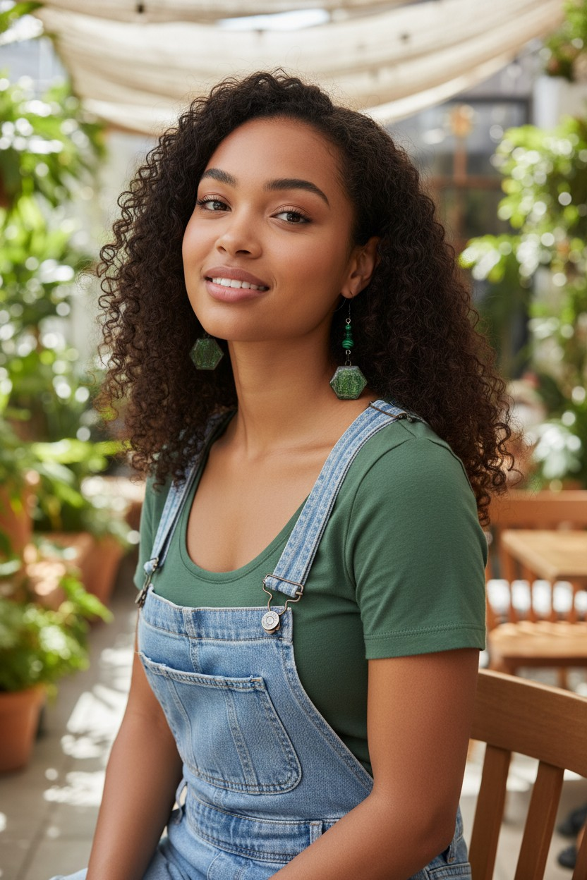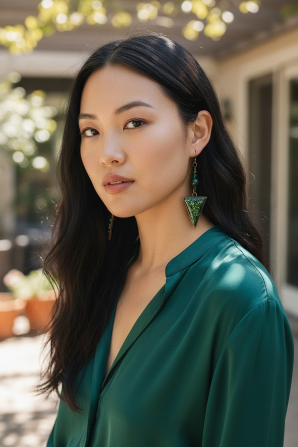 Unieke oorbellen van polymeer klei, met groen bladgoud. Afgewerkt met epoxy resin en verschillende edelstenen.